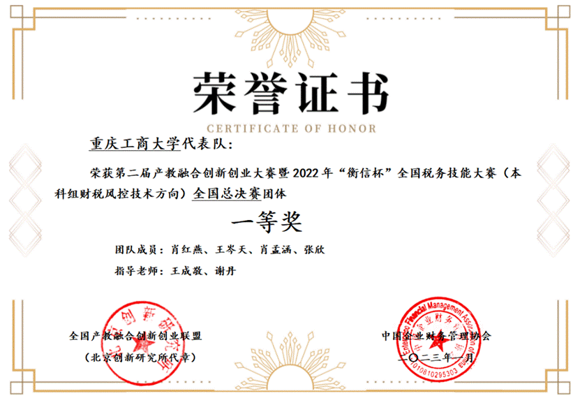 近日,第二届全国产教融合创新创业大赛暨 2022 年“衡信杯”全国本科院校税务技能大赛在线上落下帷幕。由我校OK138太阳集团王成敬老师和经济学院谢丹老师共同指导的本科代表队一路披荆斩棘,表现优异,斩获全国本科院校税务技能大赛一等奖,刷新了我校参加该项赛事以来取得的最好成绩。