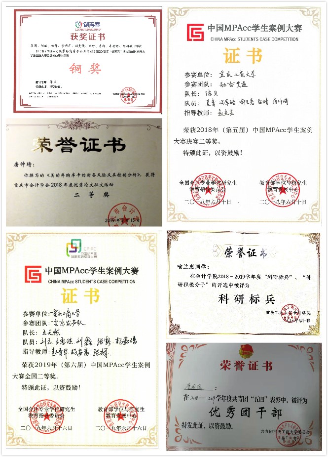 MPAcc教育中心还鼓励同学们积极参加各类校级、市级乃至国家级的学术活动和科技文体比赛,如校级的科文杯篮球赛、研究生辩论赛、研究生十佳歌手大赛、重庆市会计学会组织的征文比赛、中国MPAcc学生案例大赛、全国审计精英挑战赛、挑战杯全国大学生课外学术科技作品竞赛等。截止目前,我校MPAcc同学们获得两次中国MPAcc学生案例大赛二等奖及一次全国审计精英挑战赛二等奖、一次“创青春”全国大学生创业大赛铜奖。