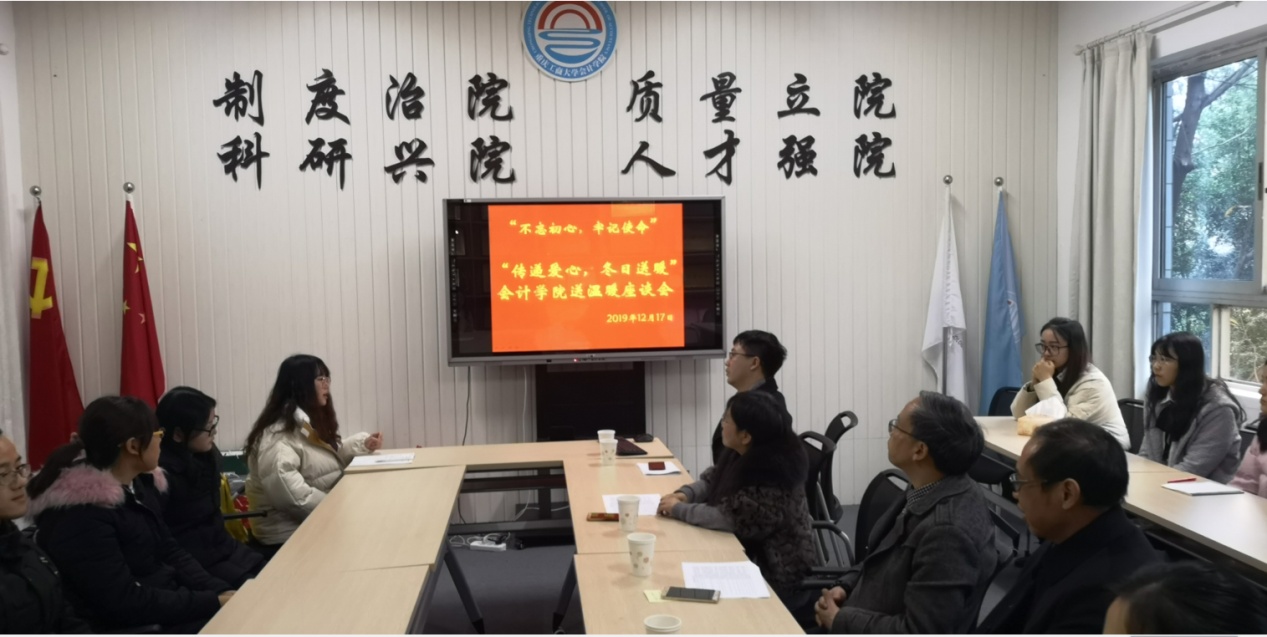 为贯彻落实“不忘初心、牢记使命”主题教育活动精神,紧扣立德树人的根本任务,牢记为党育人、为国育才的初心与使命,以实际行动切实帮助困难学生,OK138太阳集团于2019年12月17日中午12点30分,在明德楼2016举行了“传递爱心,冬日送暖”贫困生慰问座谈会。出席此次座谈会的有OK138太阳集团分党委书记罗惠玉、副书记尹建平、副院长黄辉、学工办主任彭文涛、审计系主任蒋水全及14名家庭经济困难学生代表。座谈会由学院学生资助工作负责人付海南老师主持。