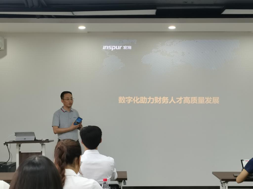 展厅参观结束后,浪潮国际重庆区总经理王宏波在会议厅为学生们讲授了题为“数字化助力财务人才高质量发展”的专题课程,同时还为老师和学生们准备了丰厚礼品。王宏波指出,德雷福斯模型为我们揭示了职业发展的方向与目标,紧跟时代步伐则是关键。他强调,新管理会计、新平台、新生态和新核算组成“四新一体”架构,引领着财务数字化转型的新风向。