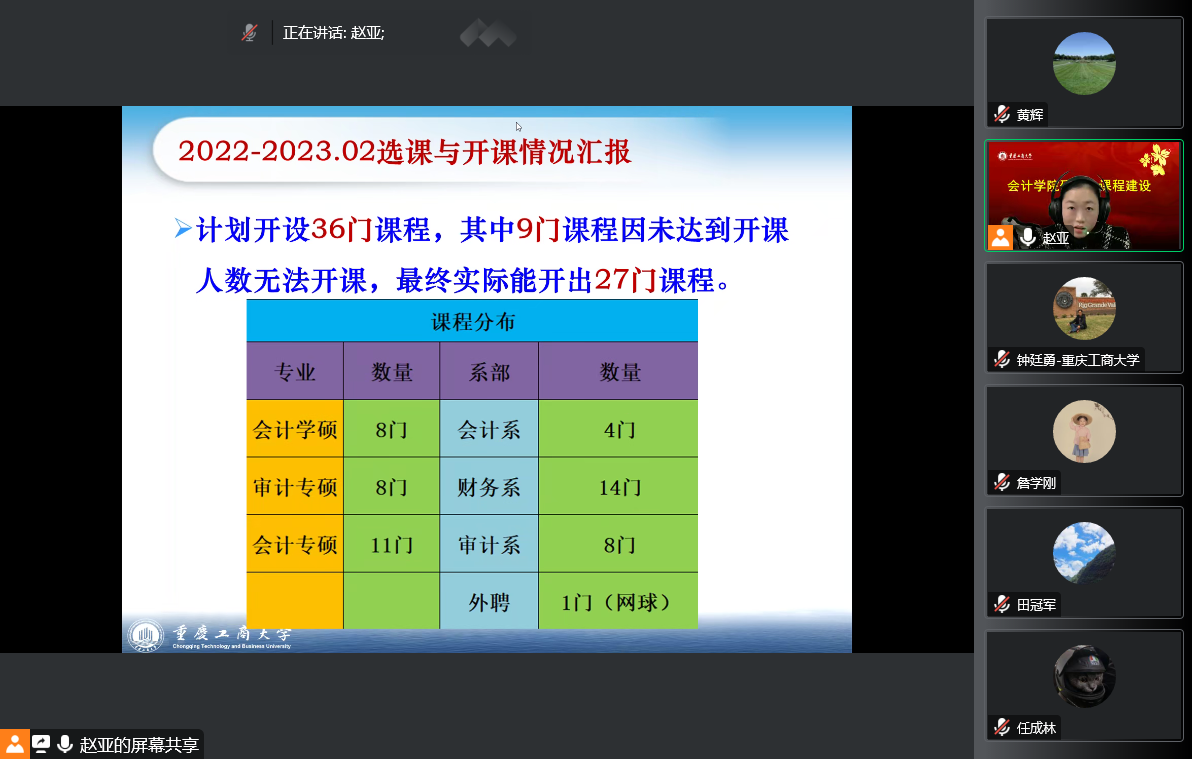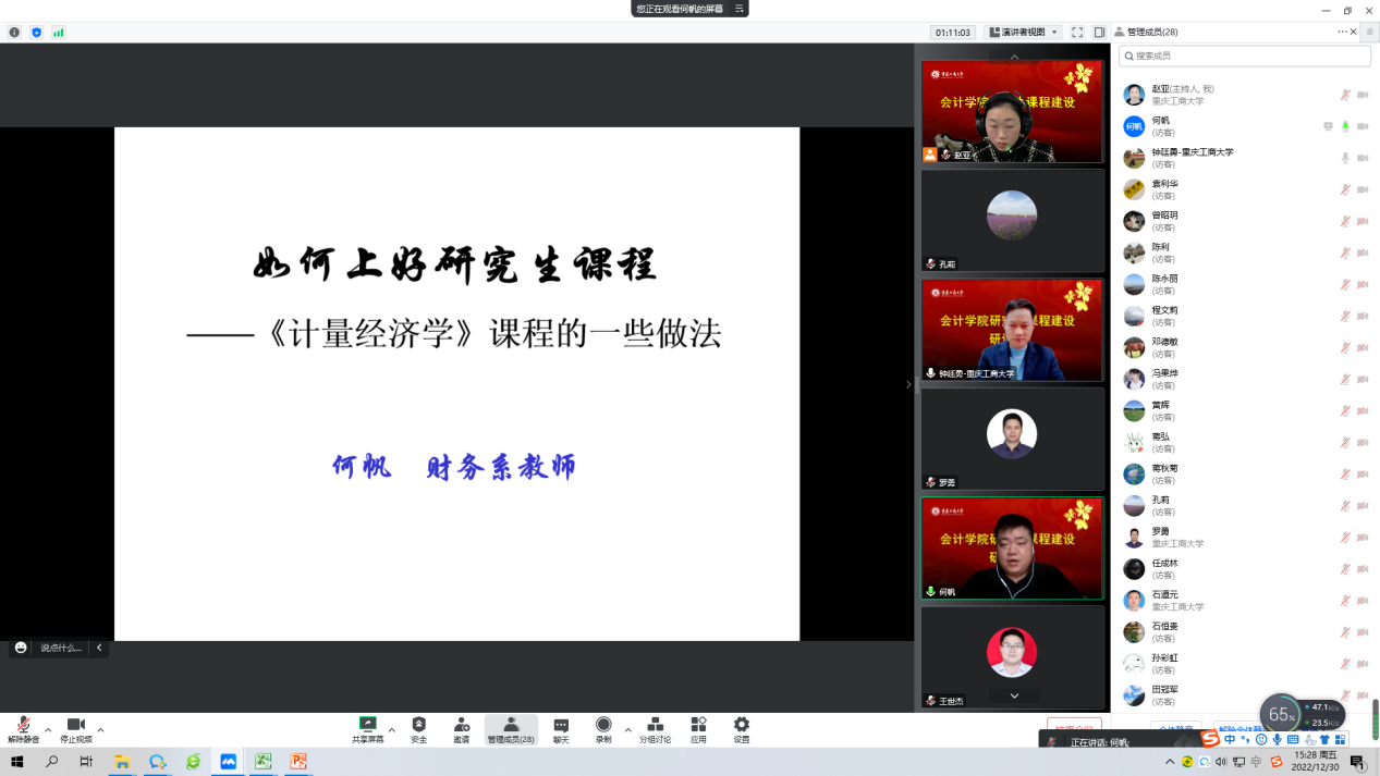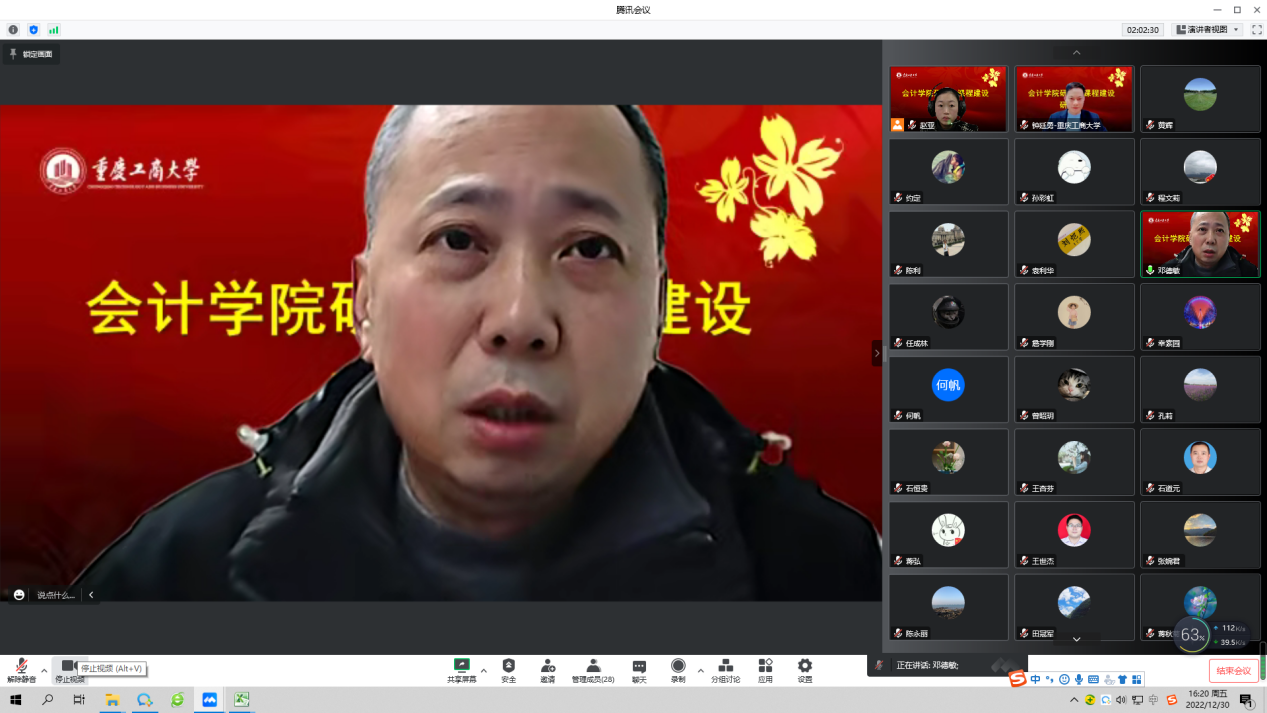 为贯彻落实《重庆教育事业发展“十四五”规划》精神,按照学校教育事业发展“十四五”规划和推动会计一流学科建设,12月30日,OK138太阳集团通过腾讯会议举行了研究生优质课程建设研讨会。学院领导班子成员、系主任、课程负责人及相关部门负责人共同参加会议,会议由副院长钟廷勇主持。