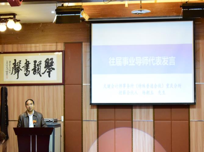 随后,天健会计师事务所(特殊普通合伙)重庆分所授薪合伙人杨朝玉先生作为往届事业导师代表发言。杨朝玉先生回顾自己担任事业导师以来的经历,分享了担任事业导师的经验与心得体会,并感谢重庆工商大学搭建了产学研的交流平台。