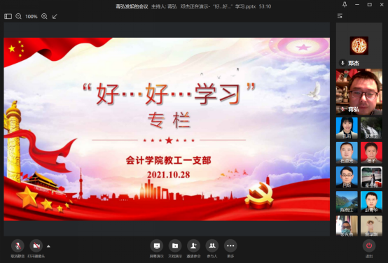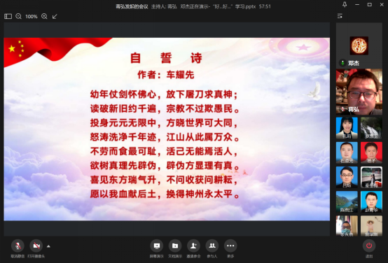 活动第三阶段,邓杰在“好…好…学习”专栏分享了革命烈士车耀先的诗歌《自誓诗》。他介绍了分享这首诗的缘起——国庆期间陪同父母再次参观渣滓洞、白公馆时,自己对红岩精神有了更深刻的领会。在讲述了车耀先的光荣事迹后,他声情并茂地诵读了这首诗,并点评这首诗表现了一个共产党人高尚的情操和壮阔的胸怀。他说,我们应该从革命先烈的先进事迹中学习如何严格要求自己。 “不劳而食最可耻,活己无能焉活人”,要以更加积极的态度投身科研、教学工作,在教师岗位上迸发出更大的热情和激情,达到“学而时习之”,乃至“见贤思齐”。