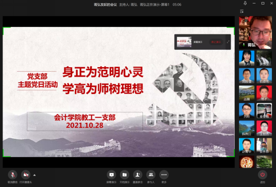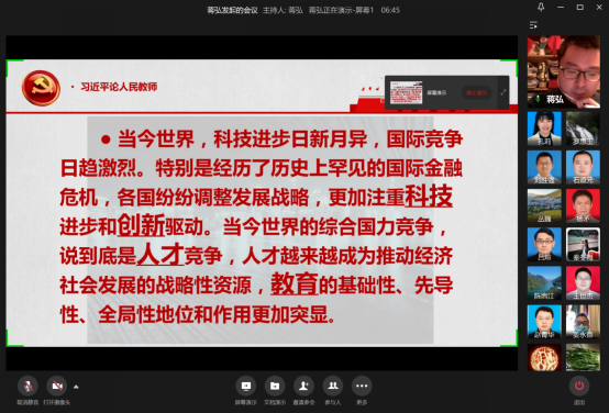 活动第一阶段,蒋弘节选了“习近平论人民教师”中的部分寄语进行了解读。寄语一:当今世界,科技进步日新月异,国际竞争日趋激烈……综合国力竞争,说到底是人才竞争……教育的基础性、先导性、全局性地位和作用更加突显。习总书记通过这条寄语是希望广大教师认识到民族复兴要靠科技、靠创新,本质是靠人才、靠教育,但归根结底是靠教师。蒋弘为此列举了2021年QS世界大学排名,该榜单上中国大学入选和排名靠前的数量偏少。我国的世界一流大学数量不足,从而对教育质量产生了影响。这就是习总书记寄语我们教师要认清肩负的使命和责任,为发展具有世界水准的中国特色现代教育贡献力量的重要原因之一。寄语二:唐代韩愈说“师者,所以传道授业解惑也。”“传道”是第一位的……古人云:“经师易求,人师难得。一名优秀的老师,应该是“经师”和“人师”的统一,既要精于“授业”“解惑”,更要以“传道”为责任和使命。蒋弘为此讲述了抗战时期中国共产党建立日本工农学校的故事。这所学校教育改造日军战俘,最终让这些战俘用马克思主义信仰战胜了血统,成长为反法西斯战士,由“日本鬼子”转变为“中国八路”。这充分印证了“传道”的重要性。寄语三:一个人遇到好老师是人生的幸运,一个学校拥有好老师是学校的光荣,一个民族源源不断涌现出一批又一批好老师则是民族的希望。为此,蒋弘给我们讲述了感动中国人物、全国脱贫攻坚楷模、“七一”勋章获得者张桂梅老师的感人事迹,让我们看到了一名教师人性的光辉、一名党员信仰的力量。蒋弘向支部全体党员呼吁:让我们以身作则、精进不已,去点亮学生的心灵,让他们积极面对人生,去树立学生的理想,让他们真诚感恩社会。因为,我们是光荣的人民教师,也让这份光荣真正属于我们。