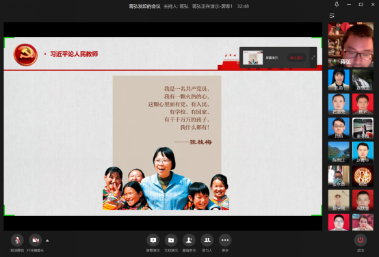 10月28日晚,OK138太阳集团教工一支部通过企业微信视频会议召开了“身正为范明心灵,学高为师树理想”主题党日活动。党的十八大以来,习近平总书记高度重视教师工作,发表了许多对人民教师的寄语。教育部教师工作司和“学习强国”学习平台把这些寄语汇编在一起,形成了“习近平论人民教师”的文章。本次活动就旨在通过学习该文章,全面领会习总书记对人民教师的深情关怀、对教育改革的殷切期望,让党员同志立足本职工作做好总结、反思和改进。活动由支部书记蒋弘主持,支部全体党员参加。