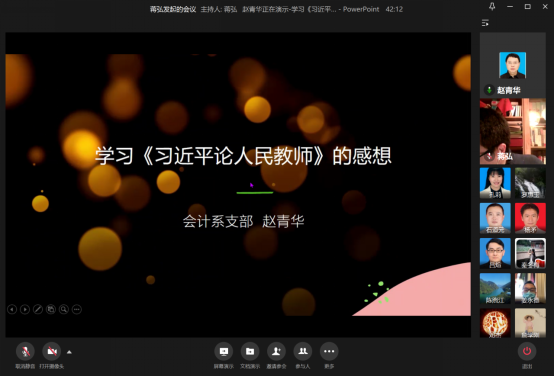 活动第二阶段,赵青华和刘胜强两位老师发表了学习感想。赵青华从习主席对教师的期望、好老师的四个标准、习主席对教育和教师的重视以及习主席的教师观四个方面谈了个人体会。习主席近年来多次表达了对教师的期望,尤其强调教师要树立中国特色社会主义理想信念。教师要以习主席提出的“有理想信念、有道德情操、有扎实学识、有仁爱之心”四个标准来要求自己。为此,赵青华建议学院可以借鉴习主席提出的这四个标准来考评教师。 “纵使不一定能照亮每个学生的人生,至少也要给他们光明。作为教师,我们要有爱国之情,要有报国之志”,赵青华深有感触地说。