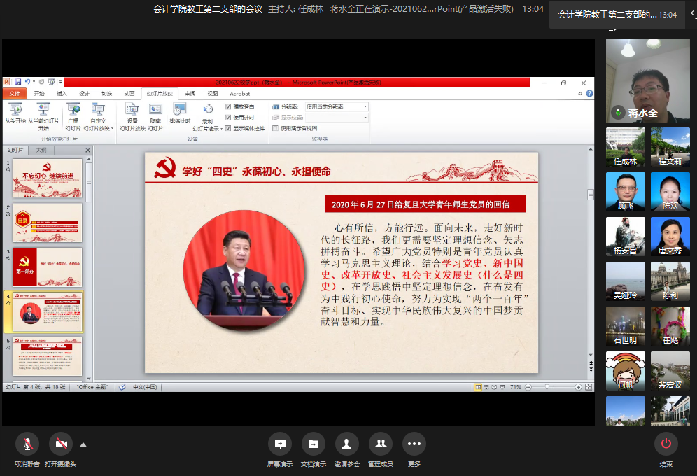 根据学校“四史”教育活动部署要求,6月28日晚,OK138太阳集团教工二支部通过企业微信视频会组织开展了“学好’四史’永葆初心、永担使命”主题党日活动。学习传承党史承载的红色基因和精神谱系,用党的光荣传统和优良作风坚定信念、凝聚力量,推动学院师资队伍高质量发展。OK138太阳集团教工二支部任成林同志主持会议。
