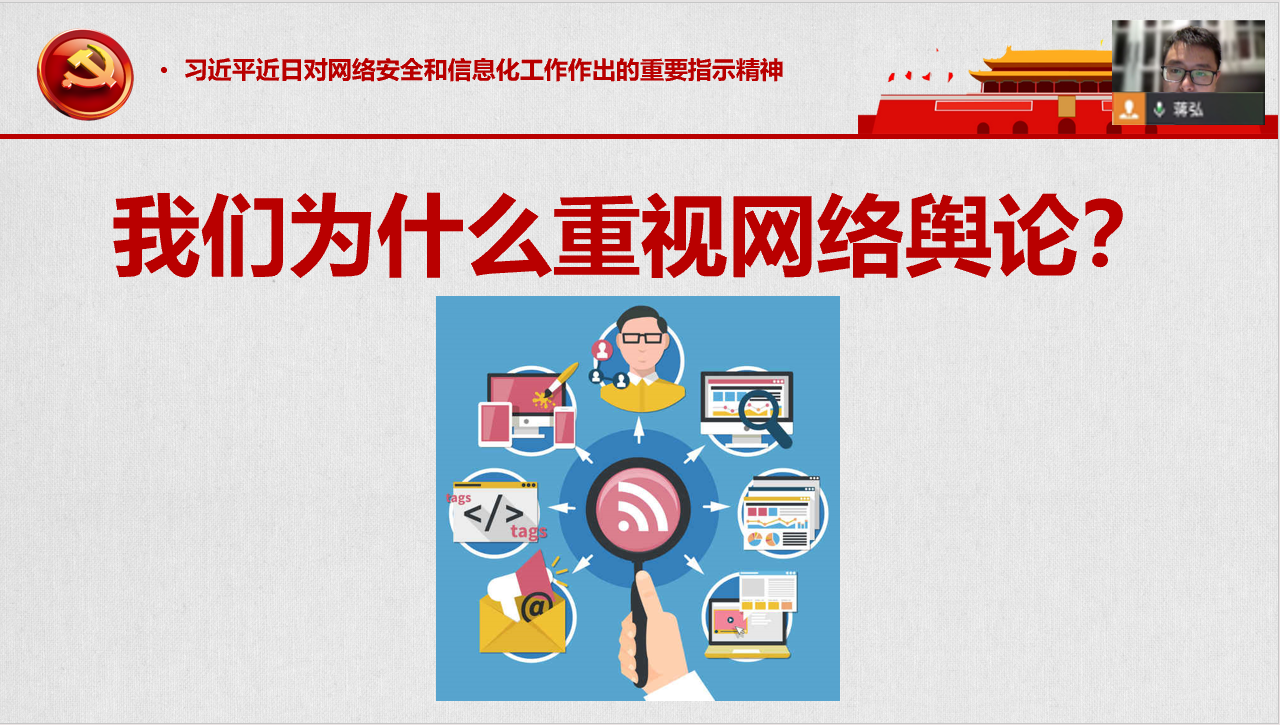 在对网络安全和信息化工作的重要指示中,习近平总书记指出了新时代新征程下网信工作的五大使命任务,即“举旗帜聚民心”“防风险保安全”“强治理惠民生”“增动能促发展”“谋合作图共赢”,并明确了“十个坚持”重要原则,包括“坚持党管互联网”“坚持网信为民”“坚持走中国特色治网之道”等。针对习总书记的重要指示,蒋弘通过讲述谷歌退出中国大陆、BBC“阴间滤镜”、西工大遭遇网络攻击、成都大运会见闻、推特封号等事例,具体谈了谈和我国网络相关的安全问题和话语权问题。关于安全问题,蒋弘认为,我国建立“网络墙”一是为了避免中国网民,特别是青少年网民,去接触一些由西方刻意制造的歪曲事实的洗脑信息,避免他们的思想和“三观”受到侵蚀,导致社会的不稳定,二是为了防范具有政治、军事等目的的网络攻击和窃密。关于话语权问题,蒋弘则认为,在信息化时代,网络像水电气一样与人们密不可分,它能潜移默化地影响人的行为。所以,重视网络舆论对一个国家来说是十分必要和迫切的。通过各种活动,在信息技术的加持下,大力宣传我国的发展现状,与美国为首的西方国家争夺网络话语权,能够有效破除西方对我国的抹黑,帮助更多人拨去迷雾,看到世界的真相。所谓“不畏浮云遮望眼,自缘身在最高层”,通过抢占网络高地这个支点,我们可以撬动整个地球。