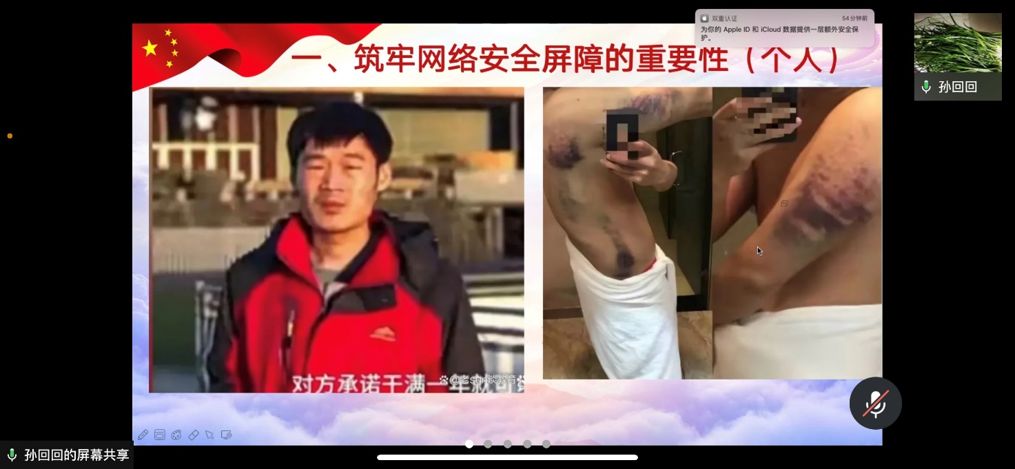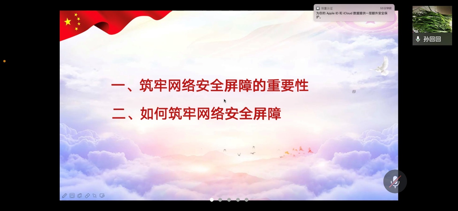 接着,孙回回围绕筑牢网络安全屏障这一话题,图文并茂地陈述了自己的学习感想。她认为,网络安全对国家和个人都至关重要,数不胜数的真实案例需要我们时刻警觉、引以为戒、举一反三。她希望支部党员从这些案例中汲取经验和教训,高度重视防范网络风险,坚定决心和信心,不断推动网络安全工作朝着做深做实的方向发展。