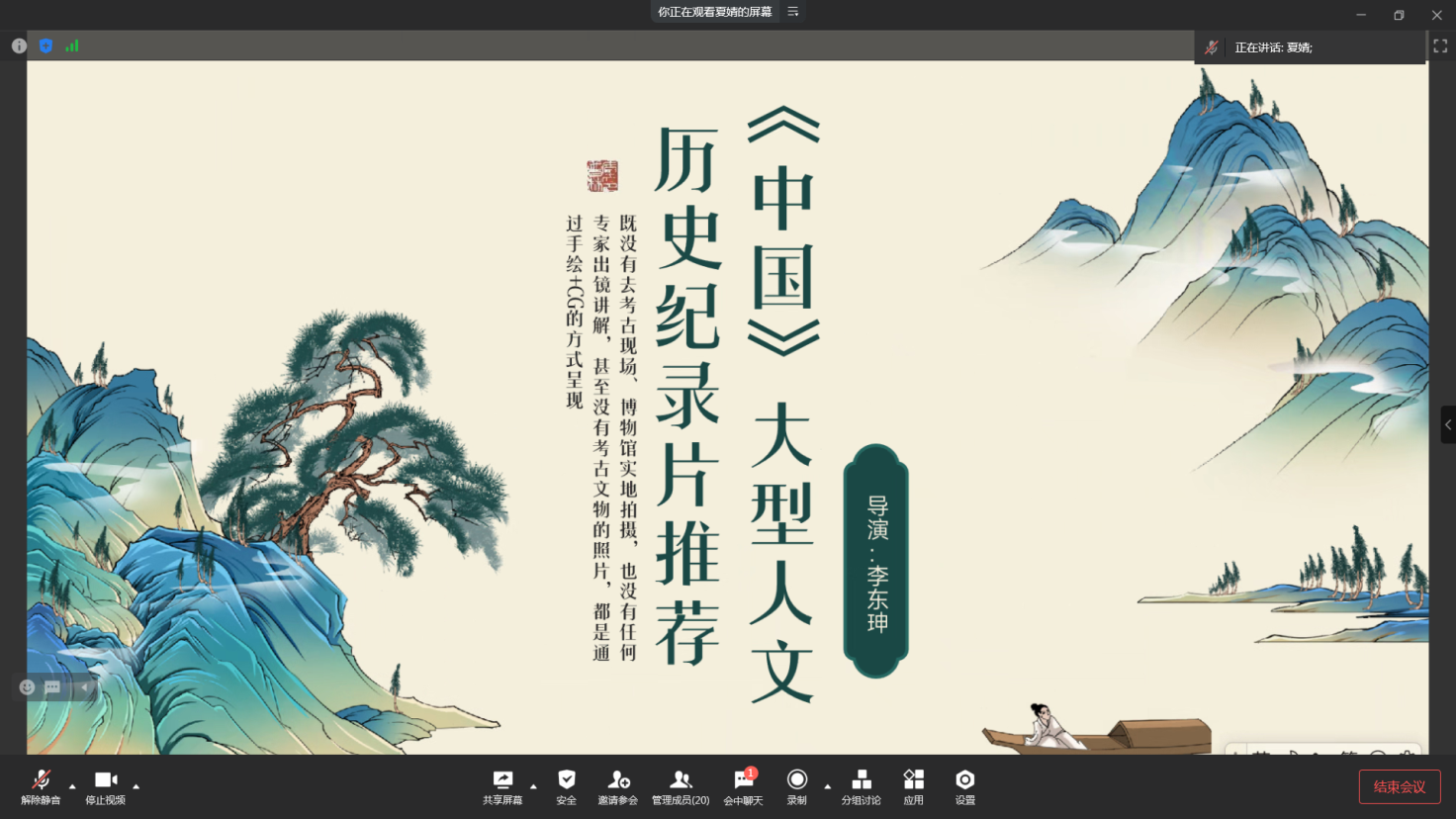 在活动的第三个环节,夏婧同志在“好…好…学习”专栏分享了大型人文历史纪录片《中国》。该片与以往将视角聚焦于某个朝代或是某段时间的历史纪录片不同,它将重点放在讲述历史上具有代表性的人物上,再现了自中华文明起源到新中国成立的浩瀚历史图景。