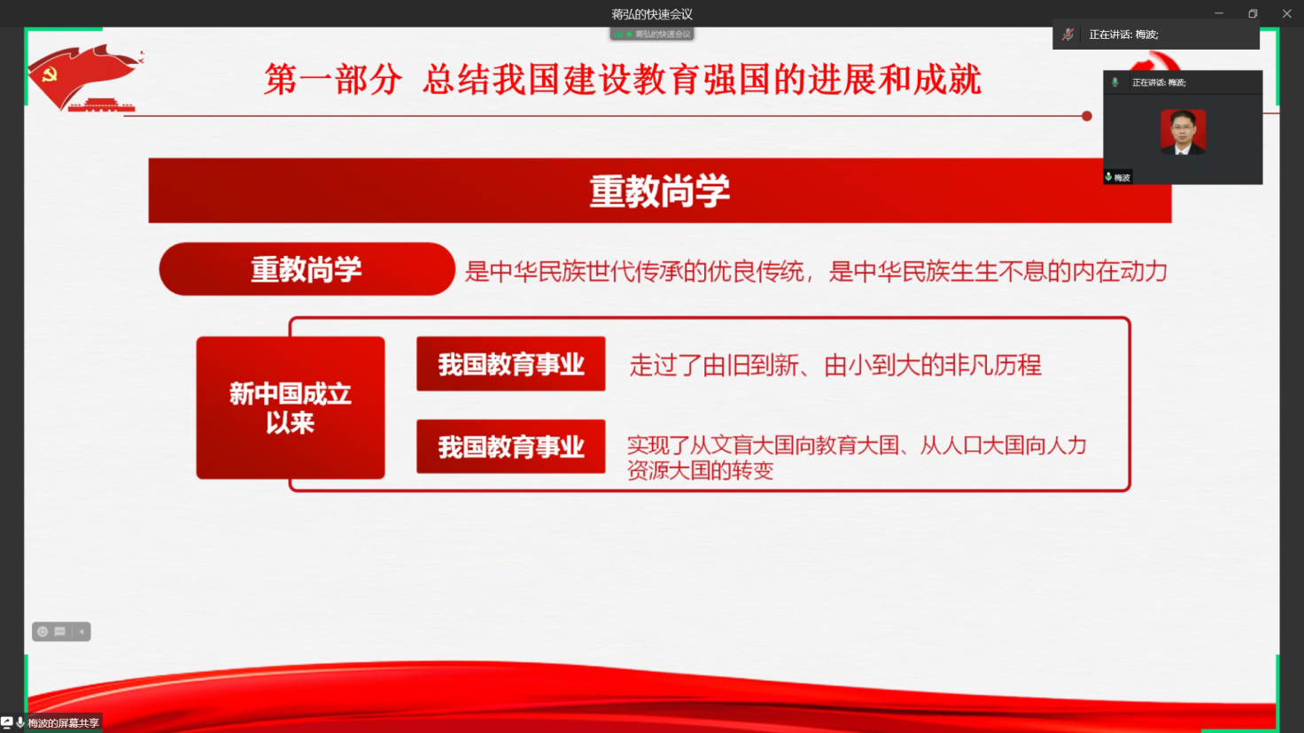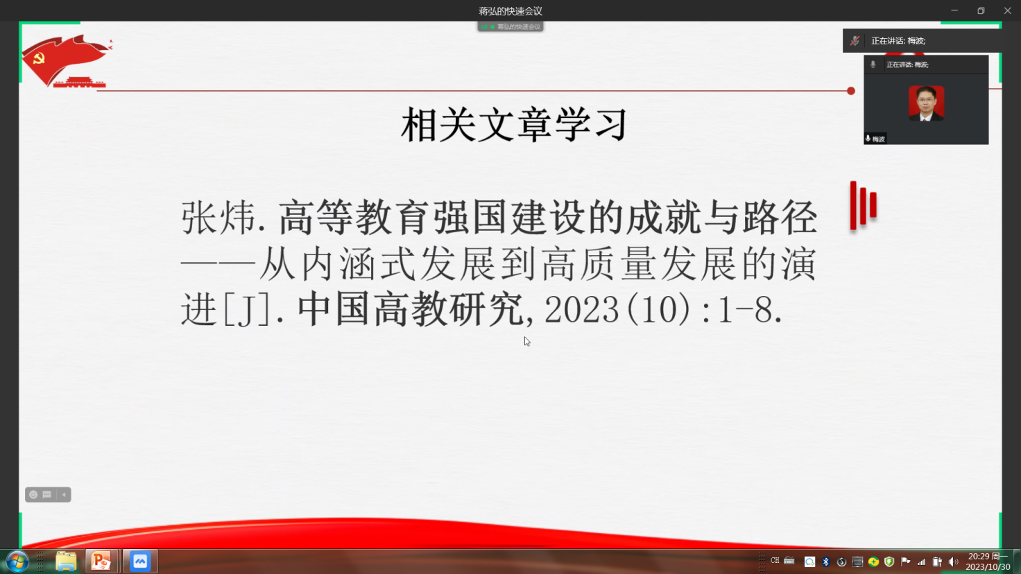 在活动的第一个环节,由支部纪检委员梅波同志领学习近平总书记在2023年9月16日出版的第18期《求是》杂志上发表的重要文章——《扎实推动教育强国建设》。在这篇文章中,习总书记总结了我国教育事业取得的巨大成就,也指出我国从教育大国向教育强国跨越的征途中仍面临不少差距、短板和弱项。总书记对如何加快建设中国特色社会主义教育强国这一问题提出了六个着力点,并明确了建设教育强国是全党全社会的共同任务。梅波同志结合领学内容,又给大家介绍了相关文章《高等教育强国建设的成就与路径——从内涵式发展到高质量发展的演进》。