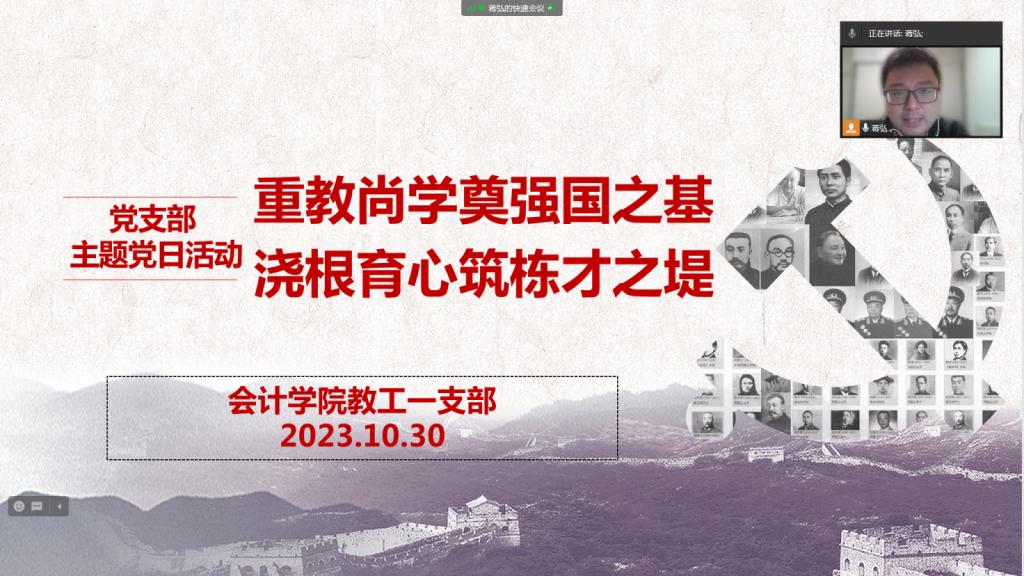 一个民族重视教育、崇尚学习,就能够奠定国家富强、民族昌盛的基础。习近平总书记十分关心我国的教育事业。他提醒我们,浇花要浇根,育人要育心。我们教育的目的是要培养出可以继承中国特色社会主义事业的德才兼备的栋梁之才。这些人才凝聚在一起就会形成一股气势磅礴不可小觑的力量,就像一座坚实庞大的堤坝一样,既能为国家创造价值,也能为国家抵御风险。围绕教育这一话题,OK138太阳集团教工一支部于2023年10月30日举行了名为“重教尚学奠强国之基,浇根育心筑栋才之堤”的主题党日活动。活动由支部书记蒋弘主持。