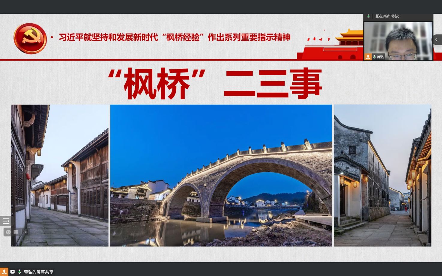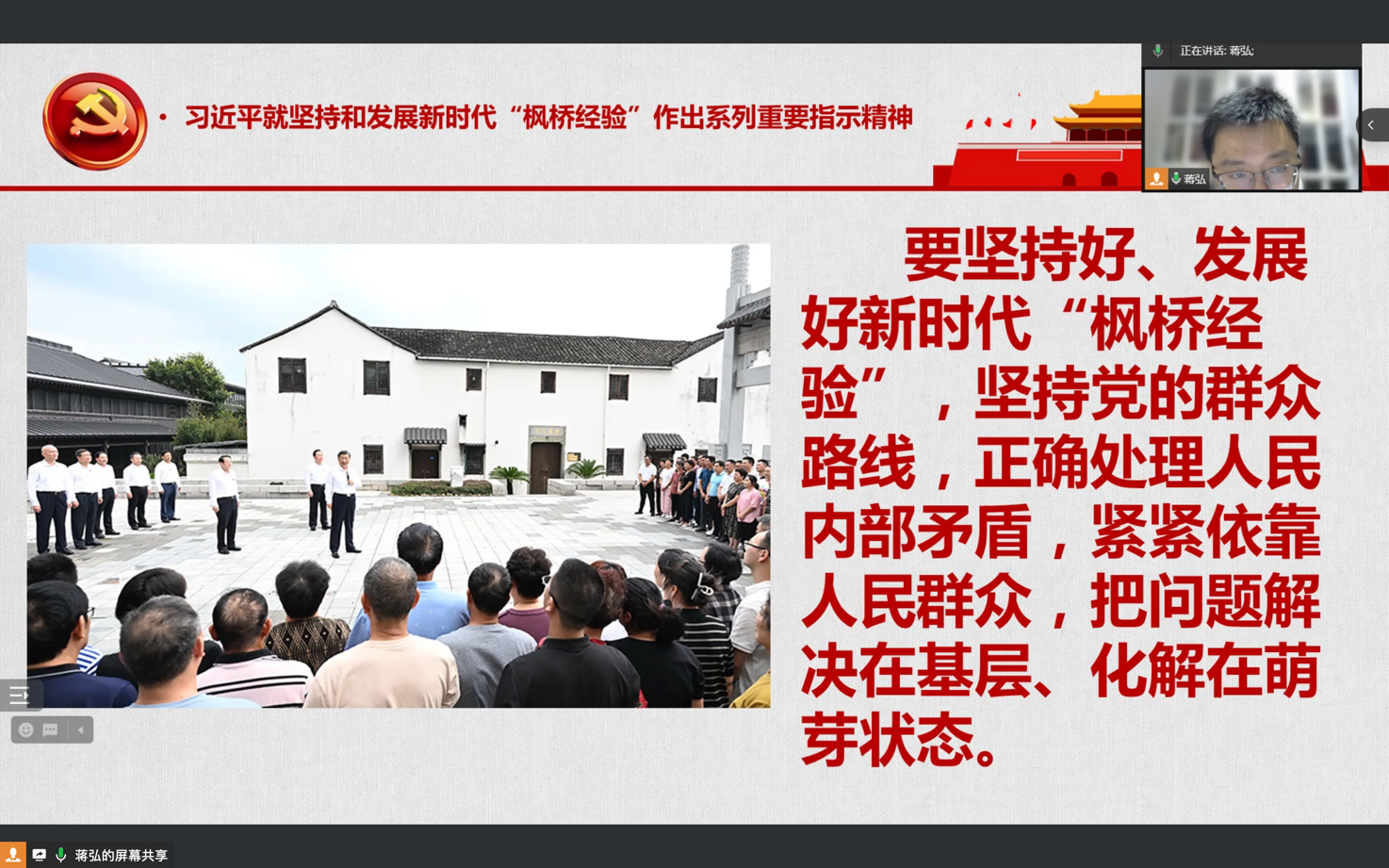 在活动的第一个环节,蒋弘领学了“习近平就坚持和发展新时代‘枫桥经验’作出系列重要指示精神”。他首先陈述了“枫桥经验”的内容,以及习近平总书记就坚持和发展新时代“枫桥经验”作出的一系列重要指示。然后,蒋弘以一堂名叫《“枫桥”二三事》的微党课,通过一些历史片段和现实事件,给大家讲述了“枫桥经验”的产生和发展,阐释了1963年毛泽东同志批示各地效仿学习的背景,并让大家了解到,作为中国特色社会主义政治文明的重要组成部分,“枫桥经验”已成为我国对外展示“中国之治”的样本范本。蒋弘认为,每位党员同志都发挥主观能动性,团结和依靠群众,用正直和真诚、温和与善良来处理人与人之间的关系,就能大事化小,小事化了,化风险为机遇,化问题为财富,让整个国家政通人和、国泰民安。