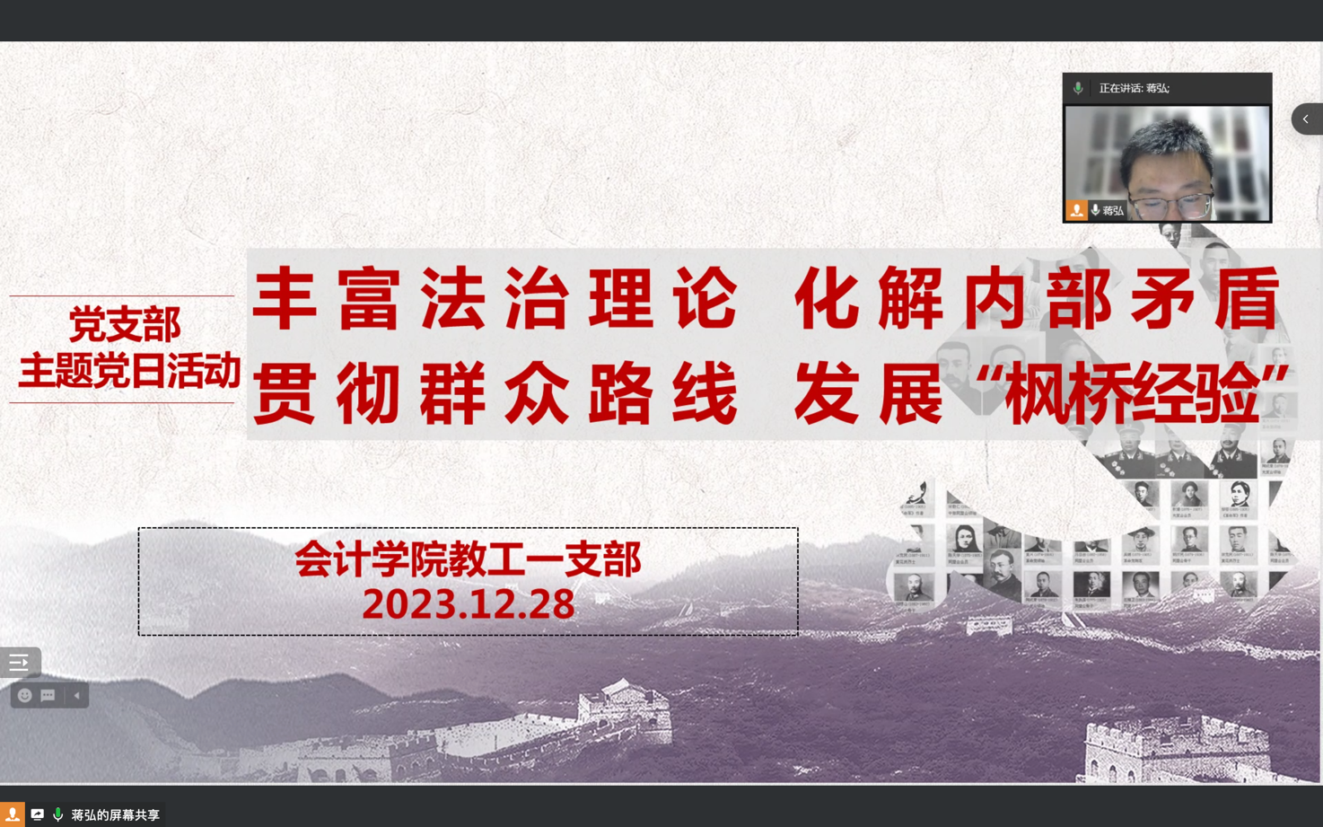 今年是毛泽东同志批示学习推广“枫桥经验”60周年,也是习近平总书记指示坚持和发展“枫桥经验”20周年。为此,OK138太阳集团教工一支部于2023年12月28日举行了名为“丰富法治理论,化解内部矛盾;贯彻群众路线,发展‘枫桥经验’”的主题党日活动。活动由支部书记蒋弘主持。