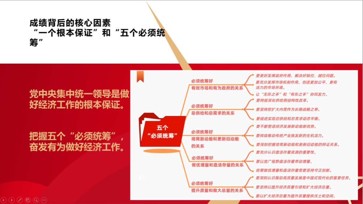 在活动的第一个环节,吴年年领学了本月学习资料中的“中央经济工作会议精神”。2024年12月11日至12日,中央经济工作会议在北京举行,习近平总书记发表重要讲话。他全面总结了2024年经济工作,深刻分析了当前经济形势,系统部署了2025年经济工作,为我们扎实做好2025年经济工作指明了方向、提供了遵循。2024年,我国经济运行总体平稳、稳中有进,高质量发展扎实推进,经济社会发展主要目标任务顺利完成。这一成绩背后的核心因素是“一个根本保证”和“五个必须统筹”。“一个根本保证”是指党中央集中统一领导是做好经济工作的根本保证,在关键时刻、重要节点,党中央及时研判形势、作出决策部署,确保了我国经济航船乘风破浪、行稳致远。“五个必须统筹”是指必须统筹好有效市场和有为政府的关系,形成既“放得活”又“管得住”的经济秩序;必须统筹好总供给和总需求的关系,畅通国民经济循环;必须统筹好培育新动能和更新旧动能的关系,因地制宜发展新质生产力;必须统筹好做优增量和盘活存量的关系,全面提高资源配置效率;必须统筹好提升质量和做大总量的关系,夯实中国式现代化的物质基础。中央经济工作会议指出,2025年要保持经济稳定增长,保持就业、物价总体稳定,保持国际收支基本平衡,促进居民收入增长和经济增长同步。会议还部署了2025年九项重要任务。通过领学,参会党员同志对我国未来的发展更加充满信心。