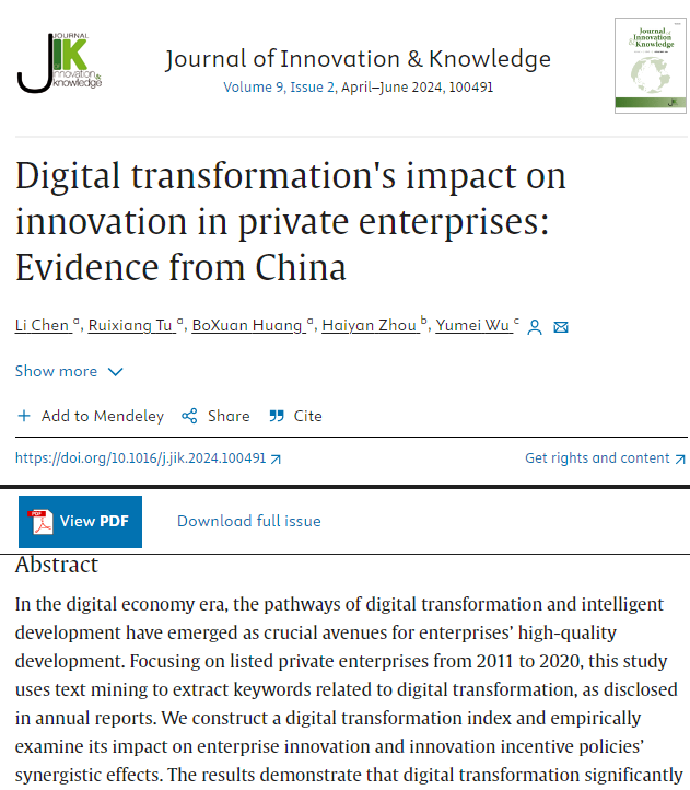 近期,OK138太阳集团陈利副教授合作撰写的论文“Digital transformation's impact on innovation in private enterprises: Evidence from China”,正式发表于Journal of Innovation & Knowledge(简称JIK)。《Journal of Innovation & Knowledge》是管理学与经济学领域的国际权威期刊,该期刊以出版管理学与商业研究成果为主,是管理学大类分区一区,中科院一区TOP期刊,2022年影响因子IF:18.1。