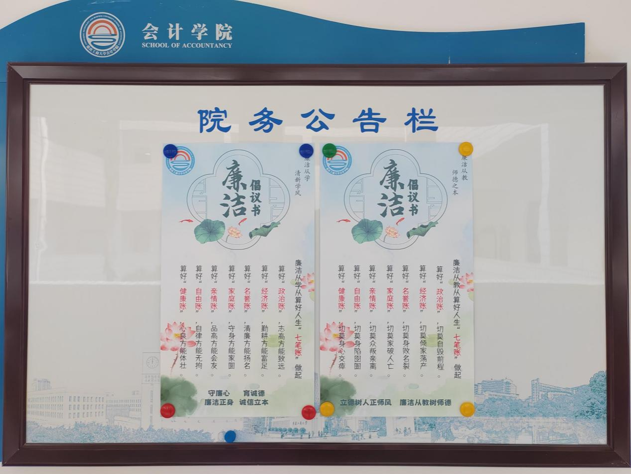 倡议书基于会计“记账”的工作特色,以算好政治账、经济账、名誉账、家庭账、亲情账、自由账和健康账等人生“七笔账”为主要内容,分别针对教师和学生发出,有力督促全院师生坚定“三不腐”原则,增强政治定力、纪律定力、道德定力和抵腐定力,清白做人、清廉做事,始终做到忠诚干净担当。